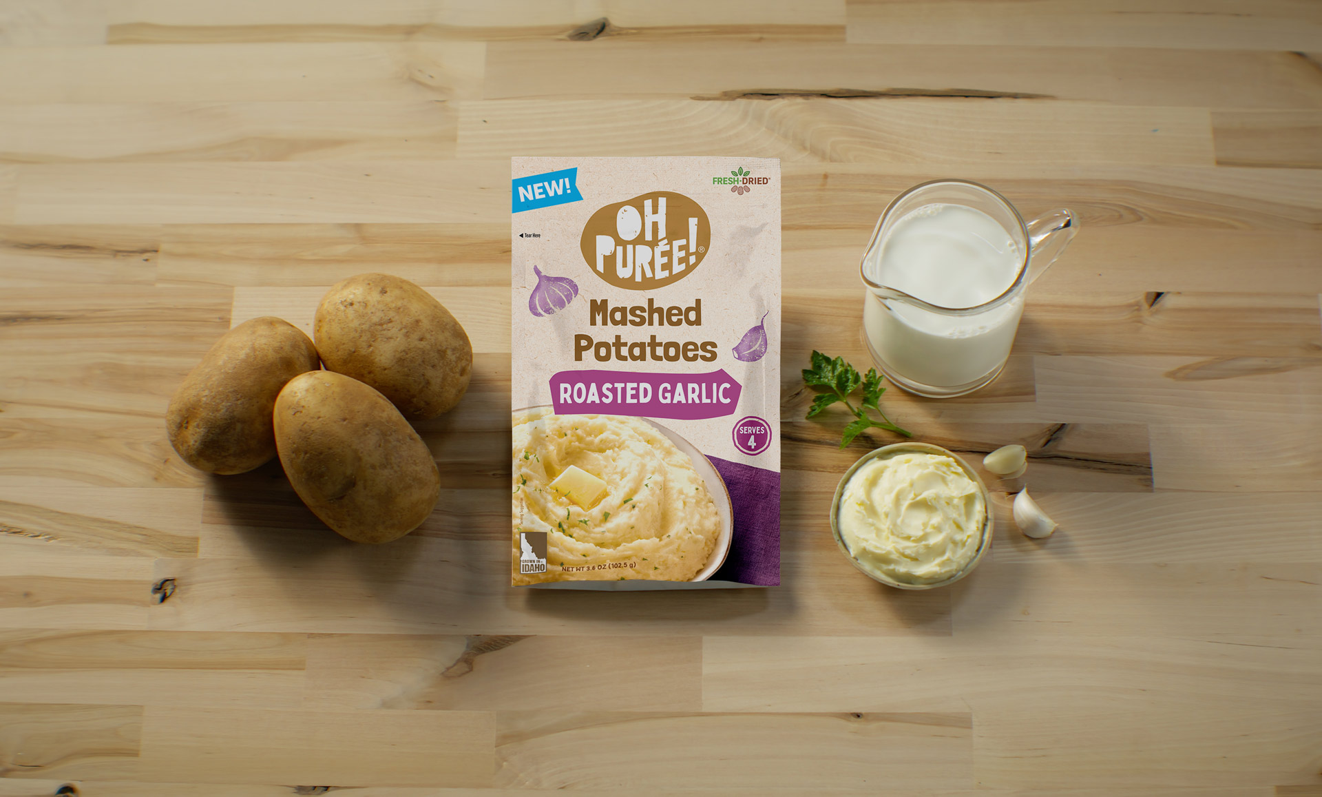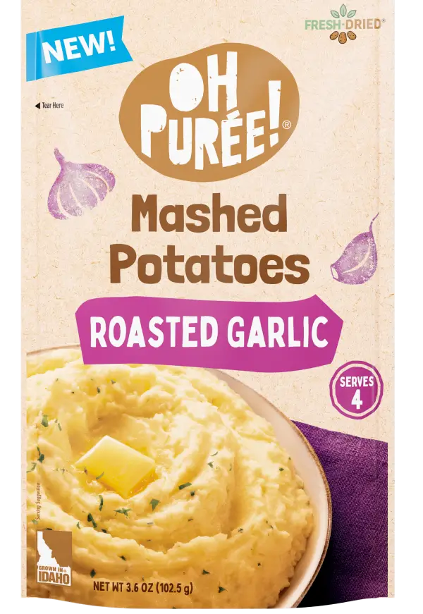 We slice, cook and mash them to perfection before simply removing the water. The result? Fresh-Dried™ mashed potatoes that taste just like homemade. Just add water, and enjoy Oh Purée! The savory experience of our Roasted Garlic Mashed Potatoes is sure to be a household favorite!